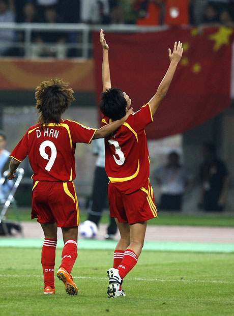 ![]() China's Li Jie (R) celebrates with teammate Han Duan after Li opened the scoring during their Group D soccer match against New Zealand in the 2007 FIFA Women's World Cup tournament in Tianjin September 20, 2007. China advanced to quarterfinals with a 2-0 win over New Zealand. [Reuters] |