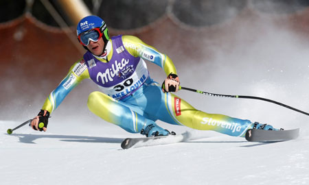Slovania's Andrej Jerman skis into a turn while placing 4th during the World Cup Men's Super-G race in Lake Louise, Alberta November 25, 2007. [Agencies]