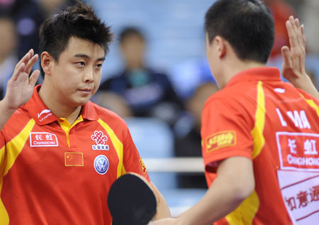 China's Wang Hao (L) and Ma Lin clap hands to celebrate after winning the semi-final game over compatriots Ma Long and Hao Shuai at the ITTF ProTour Finals, one of the testing tournaments of the Beijing 2008 Olympic Games at the Beijing University Gymnasium December 15, 2007. [Xinhua]