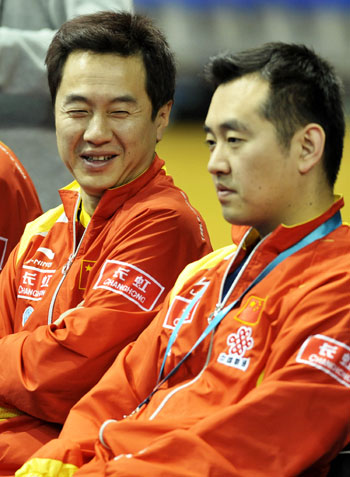 China's women's coaches Shi Zhihao (L) and Kong Linghui chat during their match against Sweden at the World Team Table Tennis Championships in Guangzhou of South China February 27, 2008. Team China won with three consecutive games. [Xinhua]