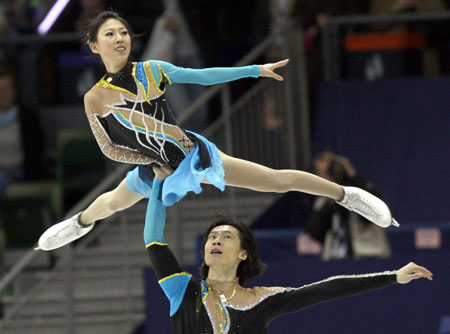 China's Pang Qing (top) and Tong Jian perform during the pairs short programme at the World Figure Skating Championships in Gothenburg March 18, 2008. The pair was ranked the fifth after the short programme competition. [Agencies]
