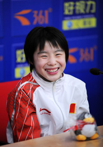 Wang Hao from Tianjin smiles during a news conference after she won the women's 10-meter platform final at the 2008 National Diving Championships in Hefei of East China's Anhui Province March 20, 2008. [Xinhua]