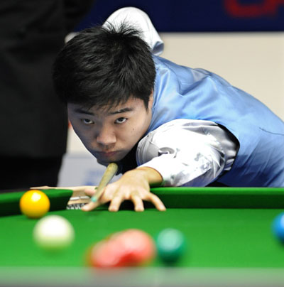 China's Ding Junhui plays a shot during the first round game against Joe Parry from England at the 2008 World Snooker China Open in Beijing March 25, 2008. The Chinese hopeful advanced into the last 16 5-3 with match breaks of 71, 71, 63, 90 and 55. [Xinhua]