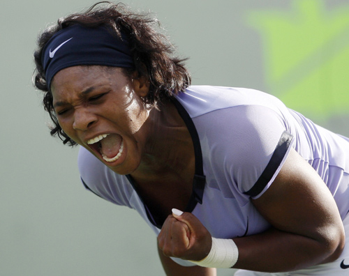Serena Williams of the U.S. reacts after winning a point against Flavia Pennetta of Italy at the Sony Ericsson Open tennis tournament in Key Biscayne, Florida March 30, 2008. [Agencies]