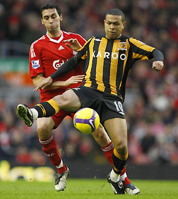Liverpool's Alvaro Arbeloa (L) challenges Hull City's Geovanni during their English Premier League soccer match in Liverpool in Liverpool, northern England, December 13, 2008. [Agencies]