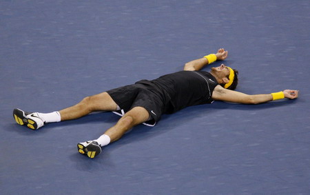 Updated: 2009-09-15 10:51 Juan Martin del Potro of Argentina reacts after defeating Roger Federer of Switzerland in their men's singles final match at the US Open tennis championship in New York, September 14, 2009. [Agencies]