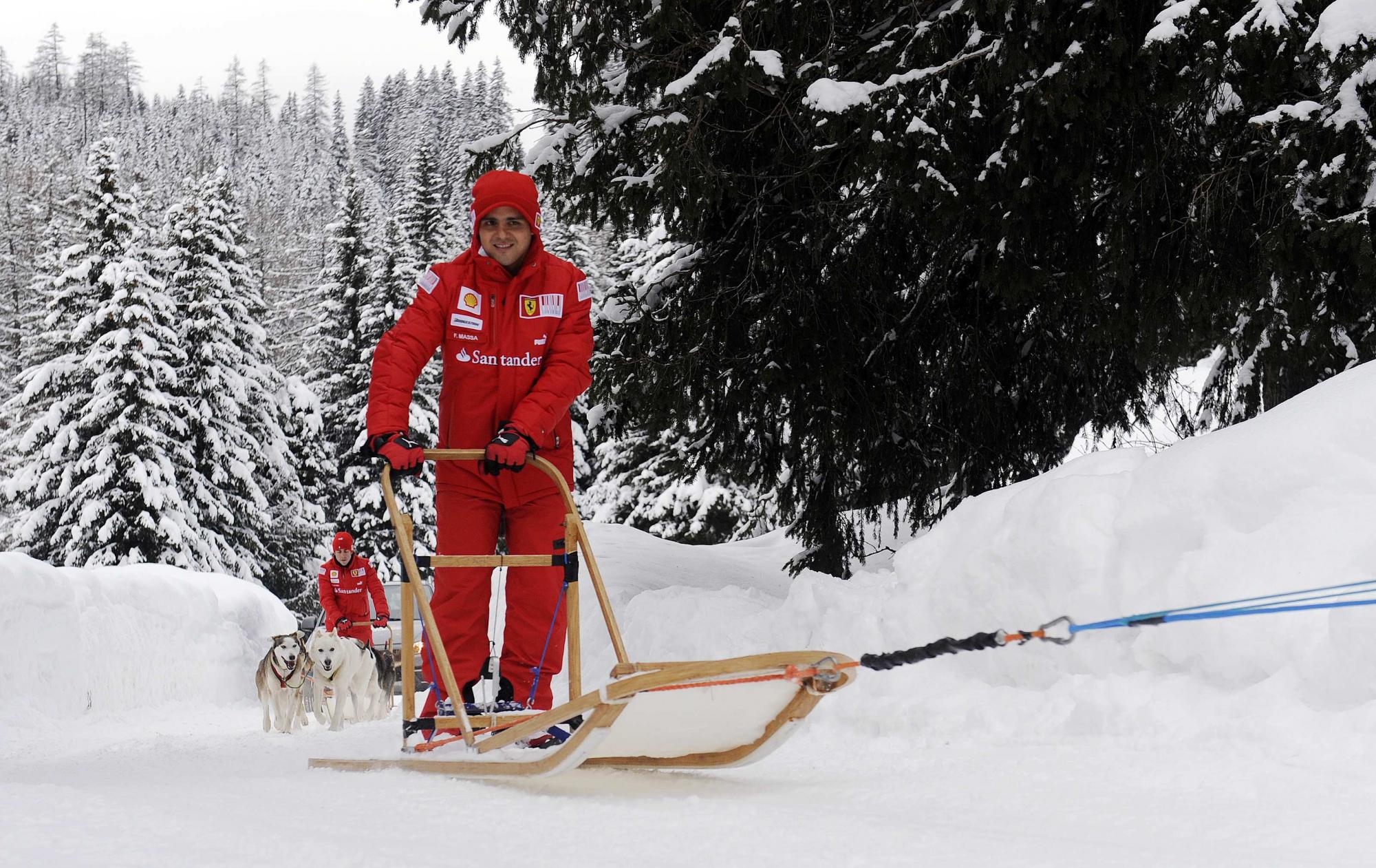 | Ferrari's Formula One driver Felipe Massa of Brazil (R) and Fernando Alonso of Spain slide in dogsleds during the "Wrooom, F1 and MotoGP Press Ski Meeting", Ducati and Ferrari's annual media gathering, in Madonna di Campiglio January 14, 2010. [Photo/Agencies] |