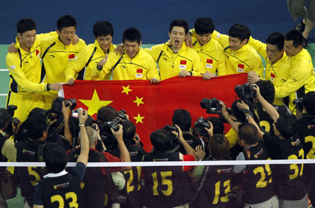 China's Lin Dan (4th L) celebrates with teammates while holding a Chinese national flag after China won against Indonesia in the final round of the Thomas Cup badminton championship in Kuala Lumpur May 16, 2010. [Photo/Agencies] |