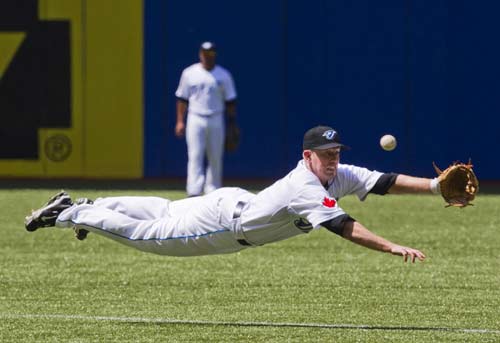 Toronto Blue Jays Aaron Hill dives for a ball and misses on a hit by Boston Red Sox Bill Hall during the seventh inning of their MLB American League baseball game in Toronto, July 11, 2010. [Agencies]