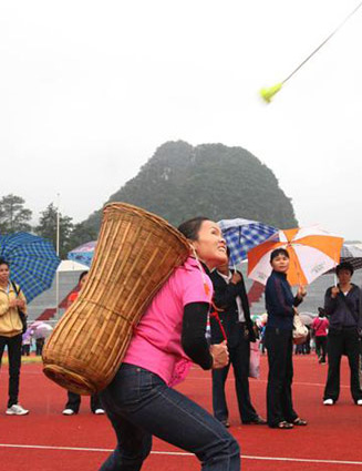 An ethnic Miao woman competes in a throwing event at the Ethnic Minority Sports Games in Rongshui county in Guangxi on Sept 24, 2010. [Photo/Asianewsphoto]