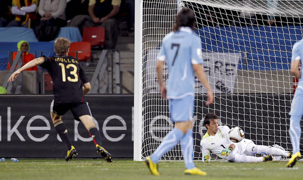 Germany's Thomas Mueller scores a goal during their 2010 World Cup third place playoff soccer match against Uruguay in Port Elizabeth July 10, 2010. [Agencies]