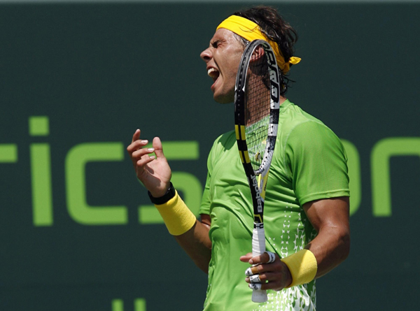 Spain's Rafael Nadal reacts after missing a shot to Serbia's Novak Djokovic during the men's final of the 2011 Sony Ericsson Open tennis tournament in Key Biscayne, Florida, April 3, 2011. [Photo/Agencies]