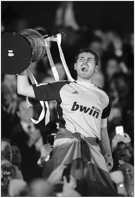 Real Madrid's captain and goalkeeper Iker Casillas lifts up the trophy in front of Spain's King Juan Carlos (bottom right) after winning the King's Cup final against Barcelona at Mestalla stadium in Valencia on Wednesday. [Photo/Agencies] |