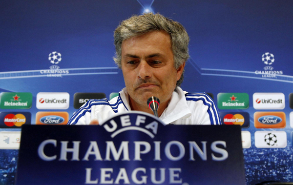Real Madrid's coach Jose Mourinho reacts during his news conference at club's training ground in Madrid April 26, 2011 on the eve of the Champions League semi-final first leg soccer match against Barcelona. [Photo/Agencies] |