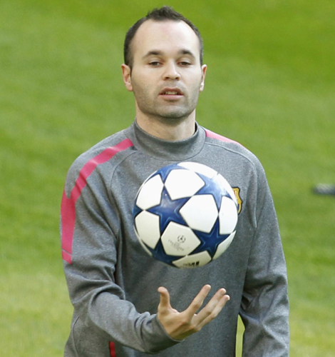 Barcelona's Andres Iniesta gestures during a training session at Real Madrid's Santiago Bernabeu stadium in Madrid, April 26, 2011. [Photo/Agencies] |