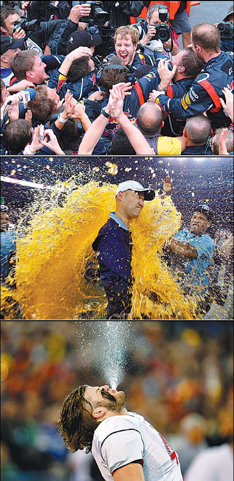 Top: Red Bull F1 driver Sebastian Vettel of Germany celebrates winning the world championship with his team after finishing sixth in the Brazilian F1 Grand Prix at the Interlagos circuit in Sao Paulo on Nov 25. Vettel became F1's youngest triple world champion at the age of 25. Center: Toronto Argonauts head coach Scott Milanovich is doused by his players after the Argonauts defeated the Calgary Stampeders in the 100th CFL Grey Cup championship game in Toronto on Nov 25. Above: Laval Rouge et Or's Arnaud Gascon-Nadon blows water from his mouth before the Vanier Cup University Championship football game in Canada against the McMaster Marauders on Nov 23. [Photo/Agencies] |
