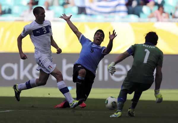 Uruguay's Luis Suarez (C) falls in front of Italy's goalkeeper Gianluigi Buffon as Giorgio Chiellini (L) challenges during their Confederations Cup third-place playoff soccer match at the Arena Fonte Nova in Salvador on June 30, 2013. [Photo/Agencies] |