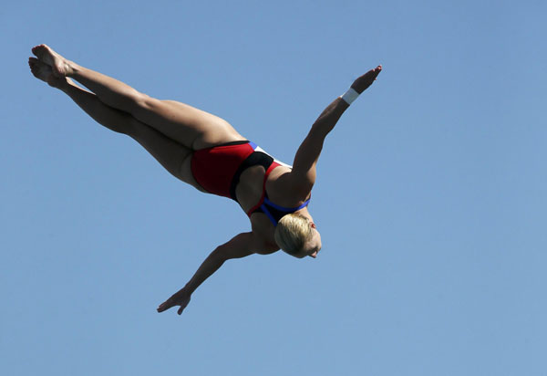 Cesilie Carlton of the US performs a dive in round 2 of the women's 20m high diving event during the World Swimming Championships at Moll de la Fusta in Barcelona, July 30, 2013. [Photo/Agencies] |