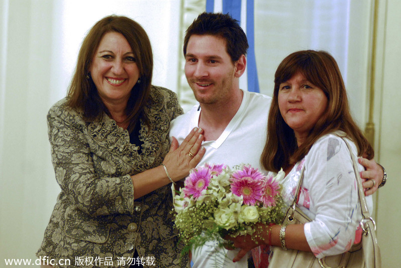 Argentina's soccer ace Lionel Messi, center, poses for a photo with his mother Celia, right, and with Monica Fein, Mayor of Messi's hometown Rosario, after being decorated as Honorary Citizen in Rosario, Argentina, Friday, Dec. 30, 2011. [Photo/icpress.cn]