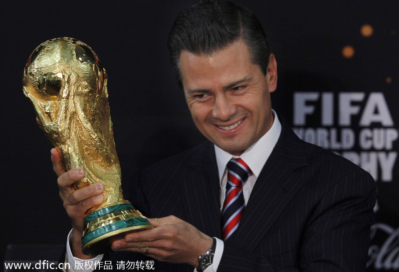 Mexico's President Enrique Pena Nieto holds the World Cup trophy in Mexico City, Feb 11, 2014 during the trophy's worldwide tour prior to next month's tournament. [Photo/IC] |