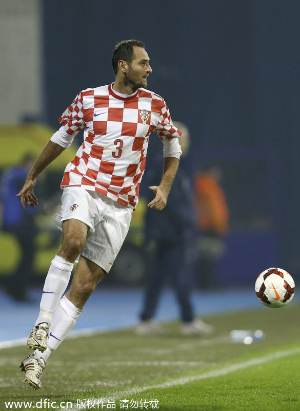 In this Nov. 19, 2013 file picture Croatia's defender Josip Simunic, plays the ball during a World Cup qualifying playoff second leg soccer match against Iceland, in Zagreb, Croatia. Simunic was banned for 10 games by FIFA for leading fans in a pro-Nazi chant after the Iceland match in Zagreb. [Photo/IC] |