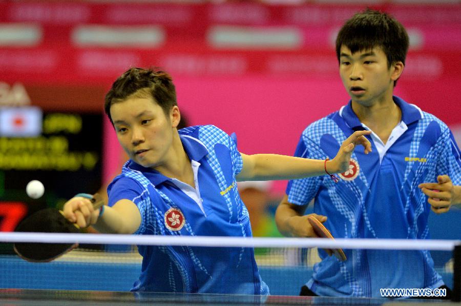 Hoi Kem Doo (L) and Ka Tak Hung of Hong Kong, China compete with team of Japan in the Mixed International Team Semifinal of table tennis event at the Nanjing 2014 Youth Olympic Games in Nanjing, capital of east China's Jiangsu Province, Aug. 23, 2014. [Photo/Xinhua] |
