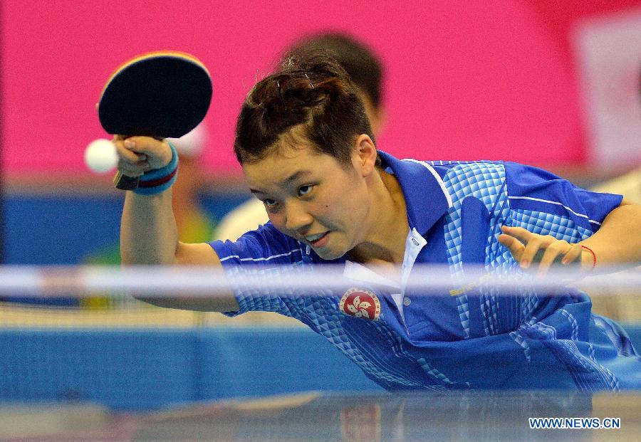 Hoi Kem Doo of Hong Kong, China competes in the Mixed International Team Semifinal of table tennis event at the Nanjing 2014 Youth Olympic Games in Nanjing, capital of east China's Jiangsu Province, Aug. 23, 2014. [Photo/Xinhua]