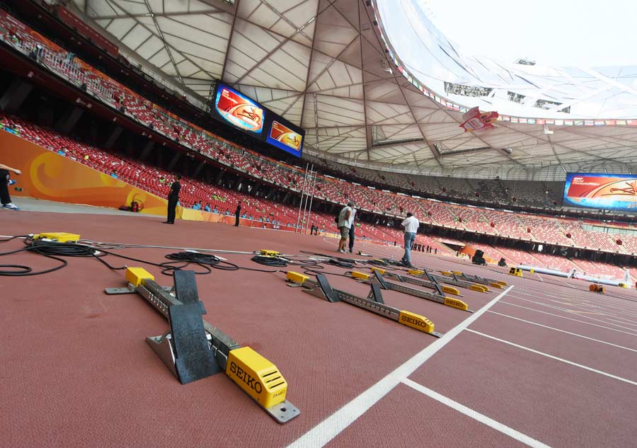 The National Stadium is all set for the championships, August 17, 2015. [Photo by Wei Xiaohao/Asianewsphoto]