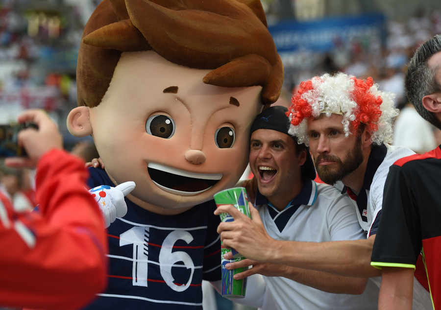 England football fans take pictures with the mascot. [Photo/Xinhua]