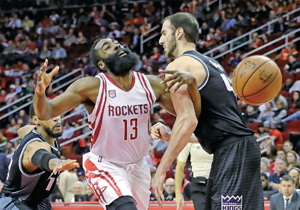 Houston Rockets' James Harden is fouled by Sacramento Kings' Kosta Koufos in the second half of Wednesday's game in Houston. AP |