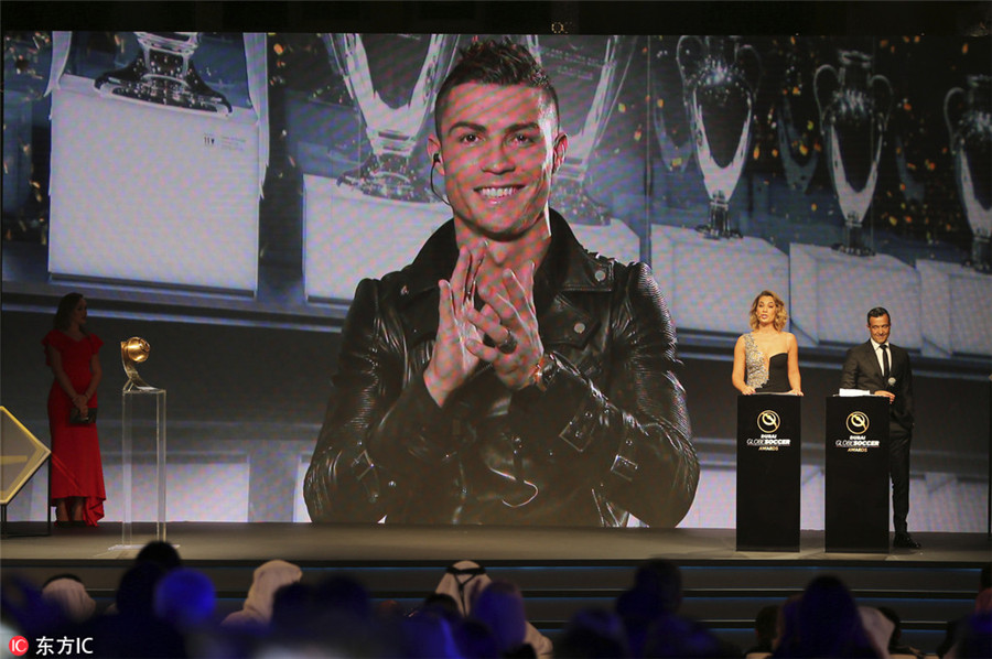 Cristiano Ronaldo, selected as the Best Player of the Year in the Global Soccer Award, thanks those who voted for him via a pre-recorded video, which has been played during Dubai Football Gala & Globe Soccer Awards Ceremony in Dubai, United Arab Emirates, on Dec 27, 2016. [Photo/IC] |