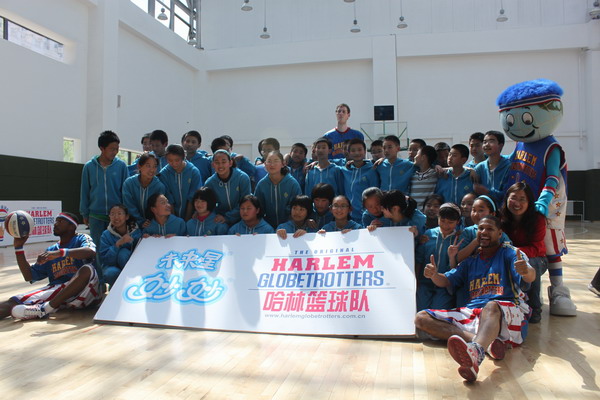 The Harlem Globetrotters and students at Beijing Runfeng School pose for photos on April 25, 2012. [Yan Weijue/chinadaily.com.cn]