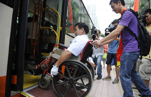 The area reserved for people with disabilities to watch the games at the main venue in Guangzhou is highlighted in this file photo on Oct 9, 2010. For the upcoming Asiad Para Games, which will take place between Dec 12 and 19, barrier-free facilities built for the competition and training venues as well as the athletes’ village have been modified to accommodate guests.