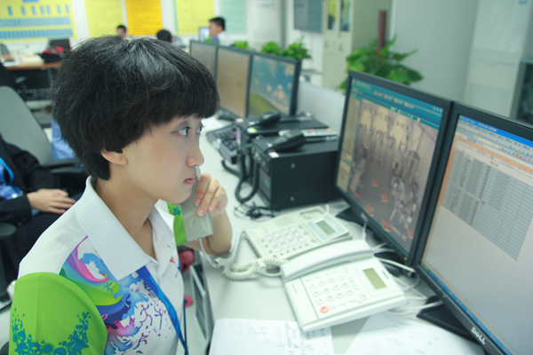 Chen Xiaobai works as a coordinator at the Security Command Center of Bao'an District Stadium in Shenzhen on Aug 12, 2011. [Photo/chinadaily.com.cn] |