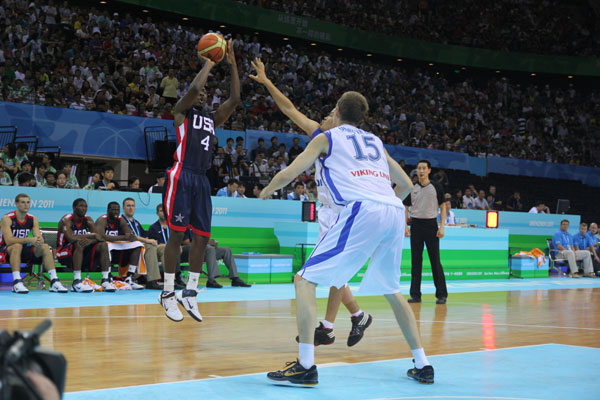 Gibbs Ashton shoots before Finnish defenders during a Universiade basketball game in Shenzhen, South China's Guangdong province, August 17, 2011.[chinadaily.com.cn]