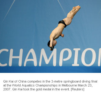 China's Qin Kai smiles as he poses with his gold medal after winning the men's 3-metre springboard competition at the World Aquatic Championships in Melbourne March 23, 2007. [Reuters]