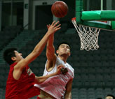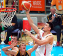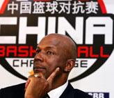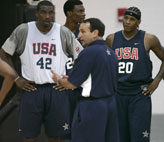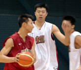 Yao Ming (L) talks to the head coach Jonas Kazlauskas (C) on 17 July druing the last training session before heading for Europe to warm up for the upcoming FIBA World Championship.
