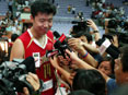 China's centre Yao Ming has a drink during practice for the world basketball championships in Sapporo August 17, 2006.