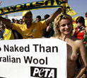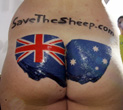 An Australian soccer fan cheers as activists from the animal rights group PETA (People for the Ethical Treatment of Animals) protest against the live export of Australian sheeps before the Group F World Cup 2006 soccer match between Brazil and Australia outside the stadium in Munich June 18, 2006. [Reuters]