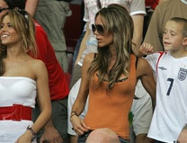 Cheryl Tweedy (L), girlfriend of England's Ashley Cole, and Victoria Beckham (C), wife of England's captain David Beckham, with their son Brooklyn (R), watch the England v Ecuador Round of 16 soccer match at the World Cup Gottlieb-Daimler stadium in Stuttgart, Germany, Sunday, June 25, 2006.[AP]