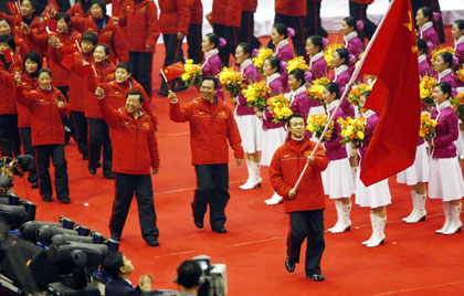 Figure skater Zhao Hongbo, the national flag bearer, leads the Chinese sports delegation at the opening ceremony of the sixth Asian Winter Games in Changchun, northeast China's Jilin Province January 28, 2007. [Xinhua]