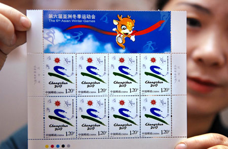 A postal worker shows a sheet of commemorative stamps for the sixth Asian winter games, to open in Changchun, Jilin Province January 28, 2007. [Xinhua]