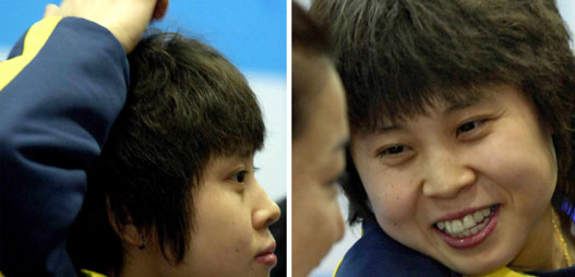 A combined photo shows China's Wang Meng during the press conference after she won the gold in the women's 500m short track speed skating at the 6th Winter Asian Games January 30m 2007. Wang finished third in the 1500m race the day before. [Xinhua]
