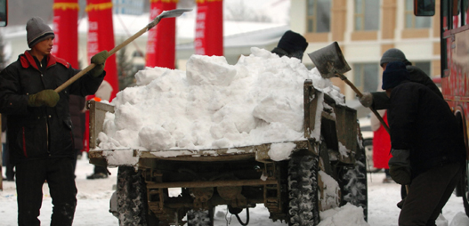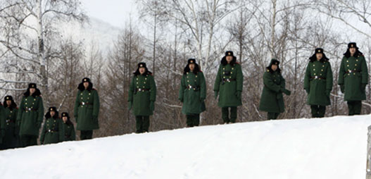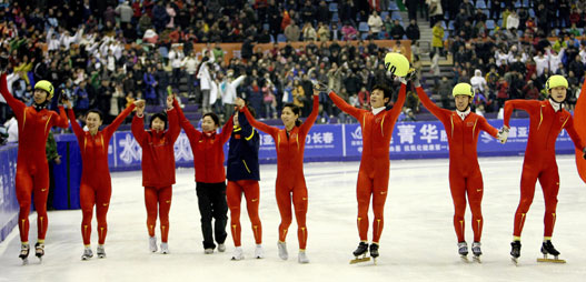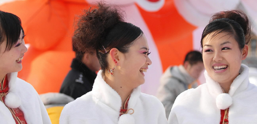 Pretty tray bearers of 6th Asian Winter Games talk with each others during the break session in Changchun,northeast China's Jilin Province, Feb.2,2007.[Xinhua]