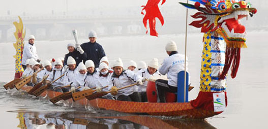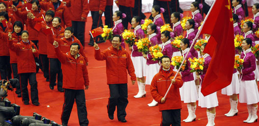 Figure skater Zhao Hongbo, the national flag bearer, leads the Chinese sports delegation at the opening ceremony of the sixth Asian Winter Games in Changchun, northeast China's Jilin Province January 28, 2007. [Xinhua]