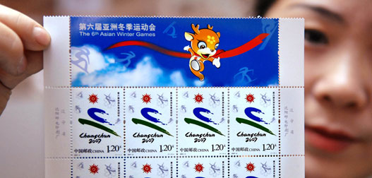 A postal worker shows a sheet of commemorative stamps for the sixth Asian winter games, to open in Changchun, Jilin Province January 28, 2007. [Xinhua]
