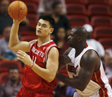 Miami Heat guard Dwyane Wade (L) passes around Houston Rockets center Yao Ming from China during their NBA pre-season basketball game in Miami, Florida October 25, 2006. [Reuters]