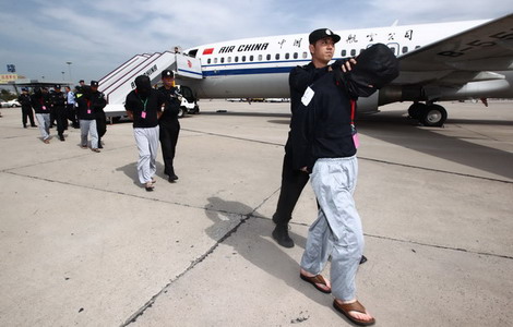 Police escort 45 detainees at Beijing Capital International Airport on Thursday after they were deported from Indonesia on suspicion of being involved in transnational telecoms fraud.