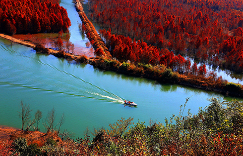 The redwood forest in the wetlands of Qinglong Bay is a worthy attraction in Ningguo city, Anhui province. When the weather is pleasant, the red leaves shimmer under the sunlight, set against the crystal-clear waters of the bay, turning the entire landscape into a virtual oil painting.