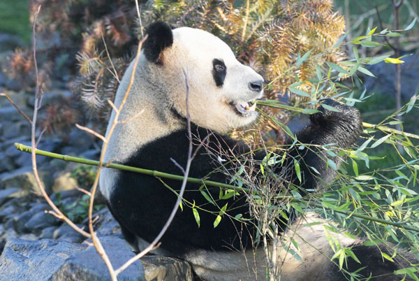 Yang Guang, a male giant panda, eats bamboo as he sits in his new enclosure at Edinburgh Zoo during a press view in Edinburgh, Scotland December 12, 2011. A pair of giant pandas have been loaned to the zoo by China, moving British officials to say that the loan strengthened ties between the two countries.[Photo/Agencies]